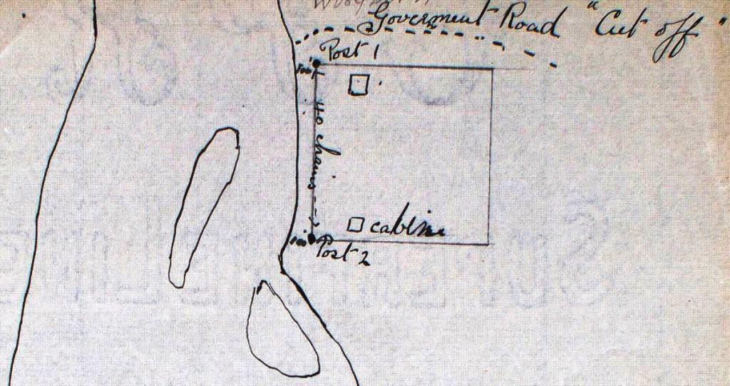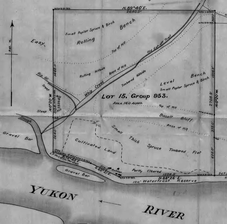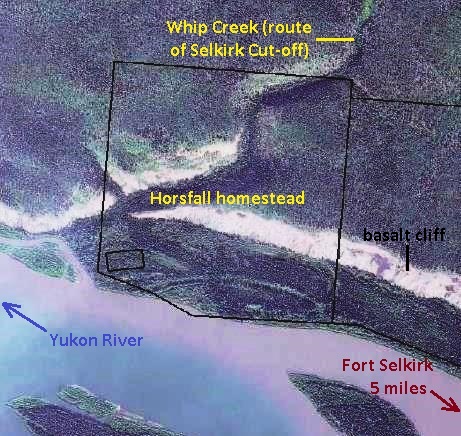 Horsfall’s sketch also showed the homestead area to be on the upriver side of the “Government Road cut-off”. When the Dawson-Whitehorse Overland Trail was built in 1902, it followed along the opposite side of the Yukon River from Fort Selkirk, therefore bypassing it by a few miles. A loop road to connect it with the Trail went west from the community and crossed the Yukon River at the location of Horsfall’s homestead at the mouth of Whip Creek, whose valley provided a break in the large volcanic basalt wall that borders the river for many miles. This road, called by a few names using the word “Cut-off”, went up the Whip Creek valley and joined onto the Overland Trail about five miles to the north of the river and homestead. (see link to related Overland Trail article at end)