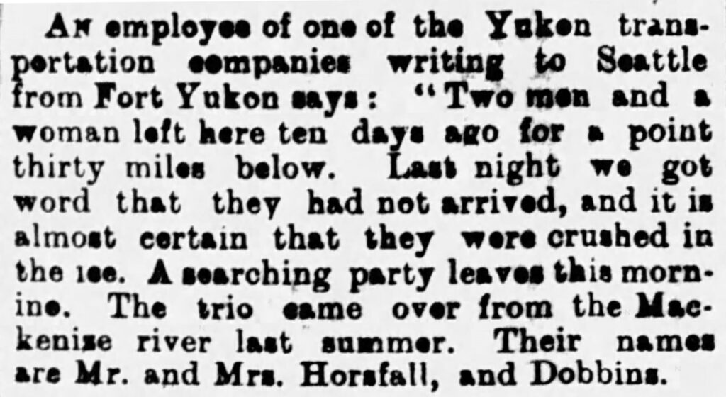 In early 1899 it was reported that Joseph and Julia along with Dobbins were missing, believed to be lost on a 30-mile trip in October 1898 down the Yukon River (west) from Fort Yukon. When they didn’t arrive it was thought that their boat was probably crushed in the ice that was running in the river at the time known as ‘freeze-up’. The details of what happened with them aren’t known, but they turned up alive and well. In 1905 when the Horsfalls met Charles Sheldon on the Pelly River in the Yukon, they told him that they had spent three seasons trapping near the head of the Chandalar River to the northwest of Fort Yukon. They were likely heading to that area to trap when they were thought to be missing or worse in the fall of 1898.