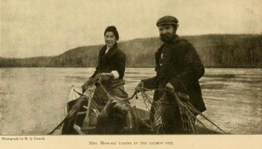 Sheldon’s book also included two good photos of the Horsfalls taken by a big-game hunter named H.Q. French in the late summer of 1909. One of the photos is of Julia and an unidentified man in a boat in the river at Fort Selkirk taking in a salmon fishing net.