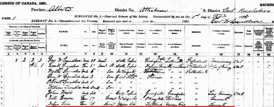 Julia Kirkby Sim’s place and year of birth are uncertain, but there is some consistency in the sources that she was born on the Yukon River in Alaska, in or about 1876. This includes the 1891 Canada census, where she appears as a 15-year old servant girl in an Anglican minister’s household in Fort Resolution, NWT, but shown to be born almost a thousand miles from there on the Yukon River. The 1900 United States and 1911 Canada censuses also have her born in Alaska. Records also indicate that Julia’s parents were a Gwich’in mother who was born on the Yukon River in Alaska and a Scottish or American father, likely a fur trader with the Alaska Commercial Company or Hudson’s Bay Company (HBC).