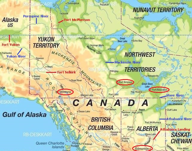 There were two main routes from Edmonton, one called the Water Route which was down the MacKenzie River system, westward on the HBC trading trail from Fort McPherson into the Yukon and Alaska, then up the Yukon River from Fort Yukon to Dawson, a total distance of over 2,500 miles. The other route was the Overland Route which had many variations that were on the order of 1,500 miles long, most with the objective of getting to the Liard River, ascending it to the divide over to the Pelly River, then going down the Pelly and Yukon Rivers to Dawson. Because the gold rush to the Yukon did not seriously commence until the summer of 1897, making a start by any of the routes from Edmonton at that time required taking a two-year food supply and overwintering somewhere along the way.