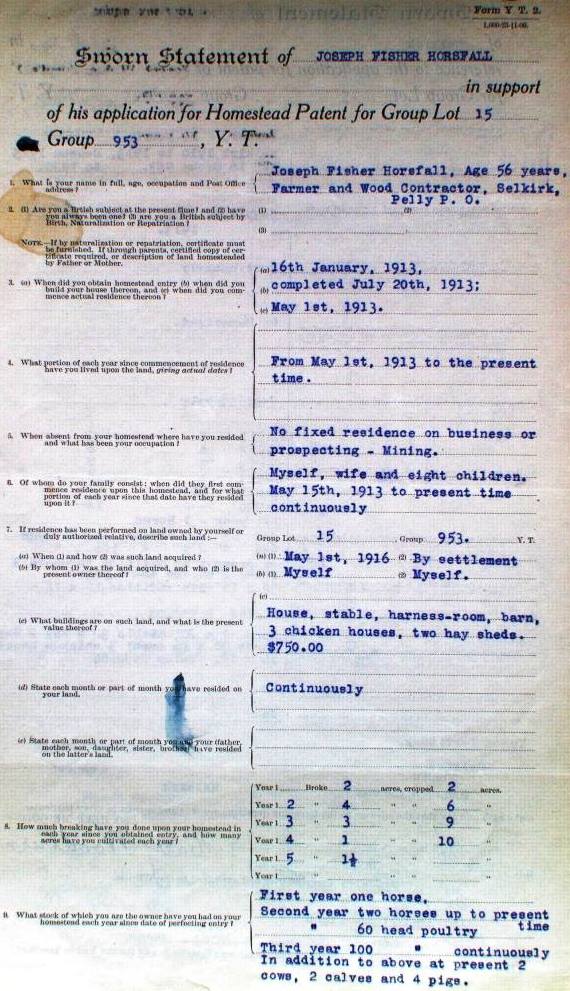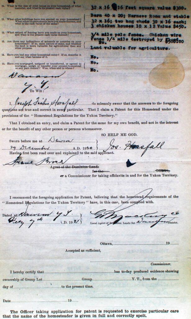 The family appears to have remained in Fort Selkirk while Joseph was preparing a life for them at the homestead and making a living there as a woodcutter at the same time. In the 1911 census, Joseph and Julia and their daughters were shown to be at Fort Selkirk, where their fifth daughter, May, was born in March 1911. The family began living on the homestead on May 1, 1913, and in August of that year their sixth daughter, Anna, was born at Fort Selkirk.